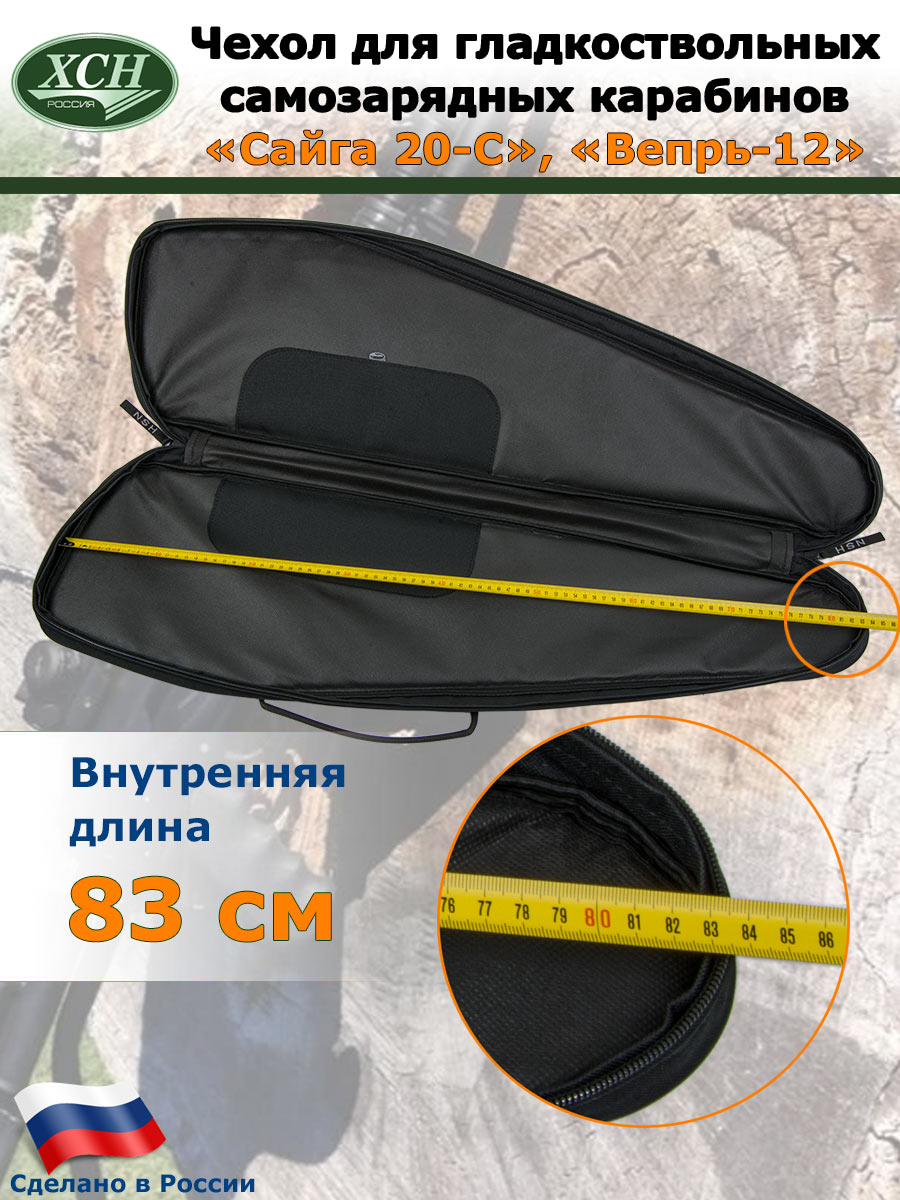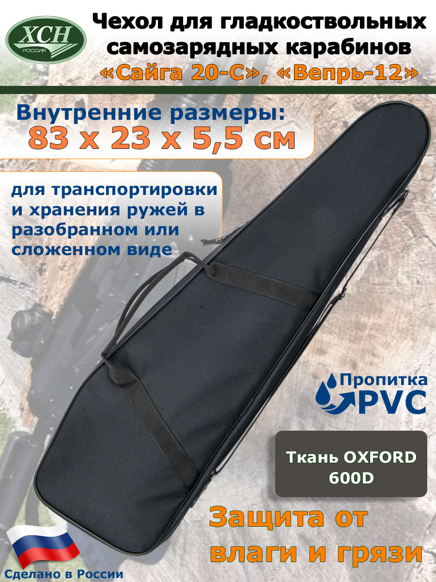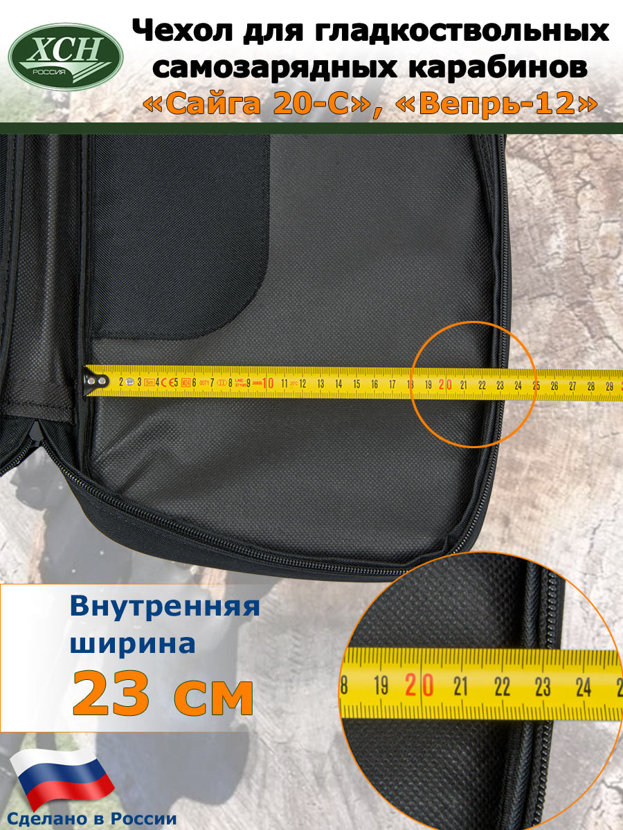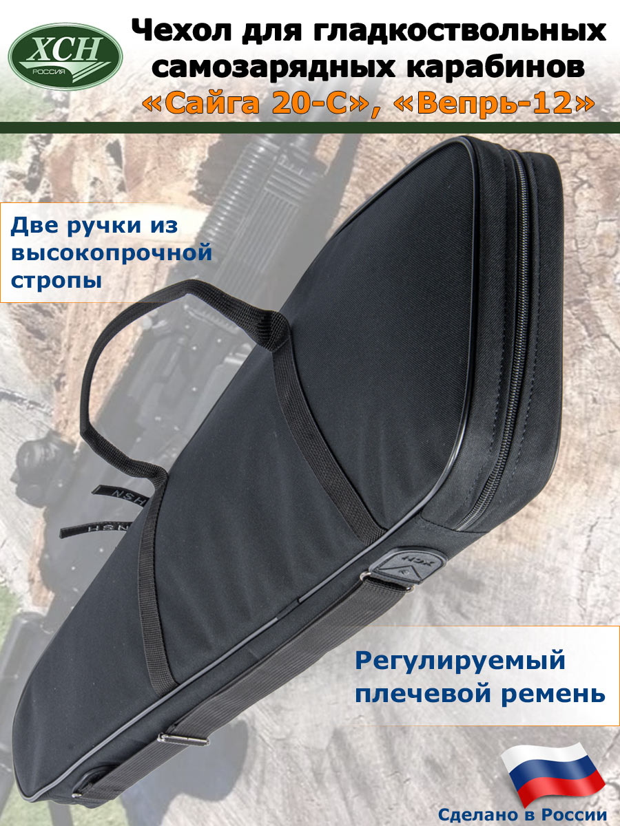 Разработка учитывала особенности ружья «Сайга-20С» — наличие рукоятки ведения огня и складного приклада, что делает чехол идеально подходящим для этой модели, а также совместимым с Вепрь-12 (ВПО-205).