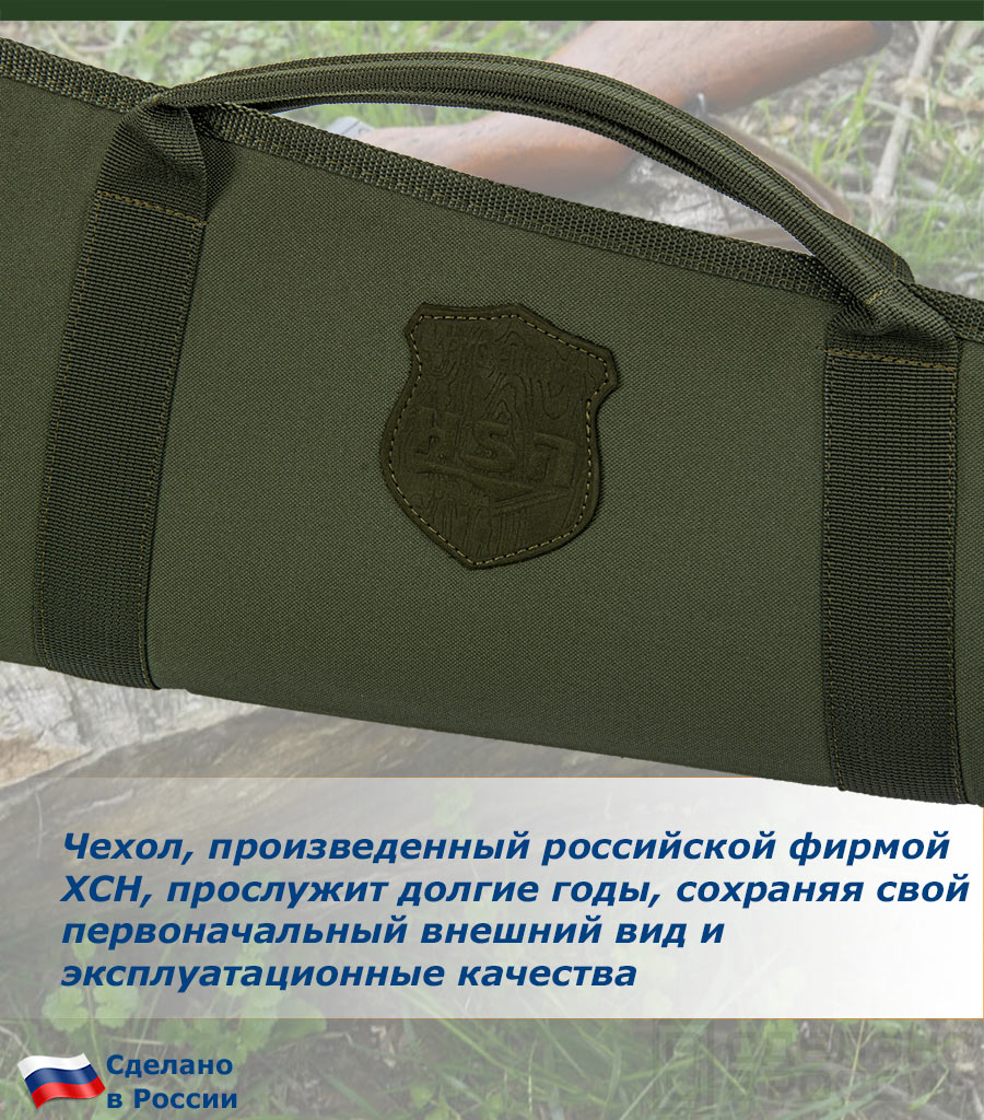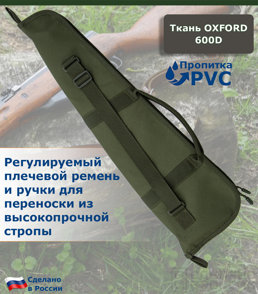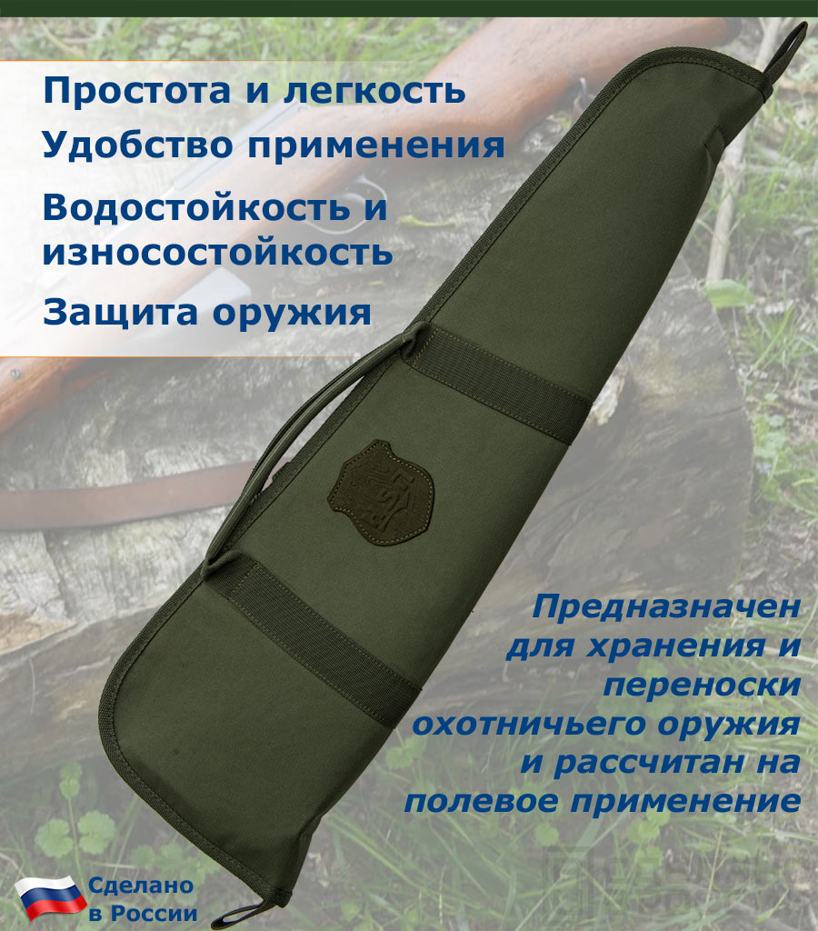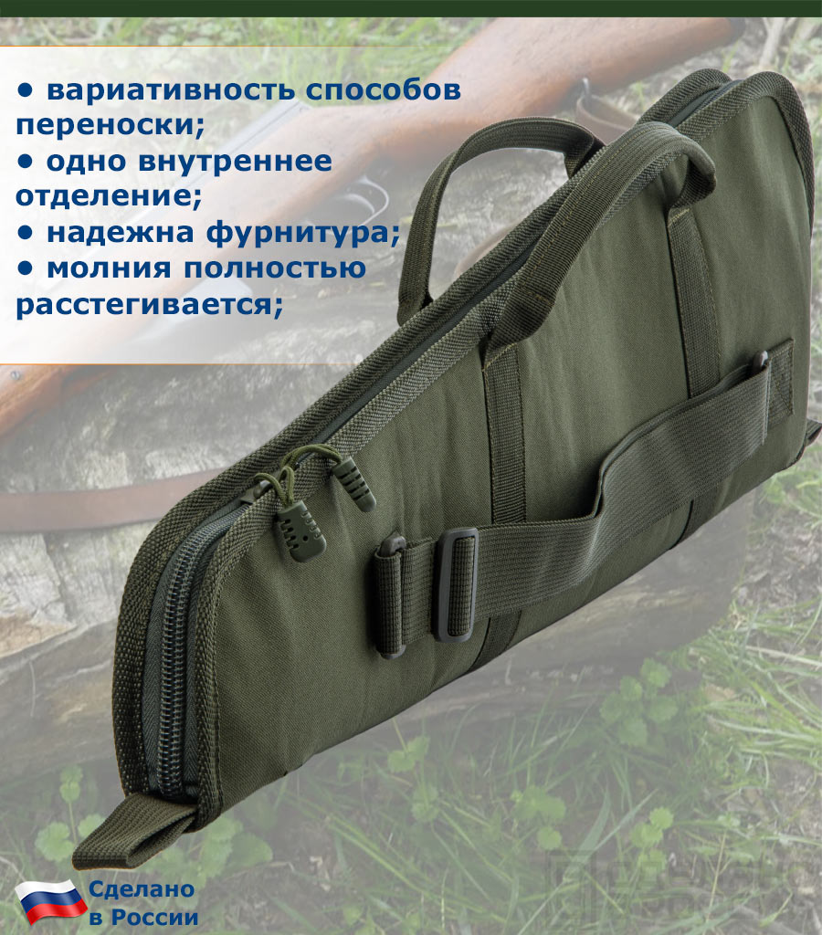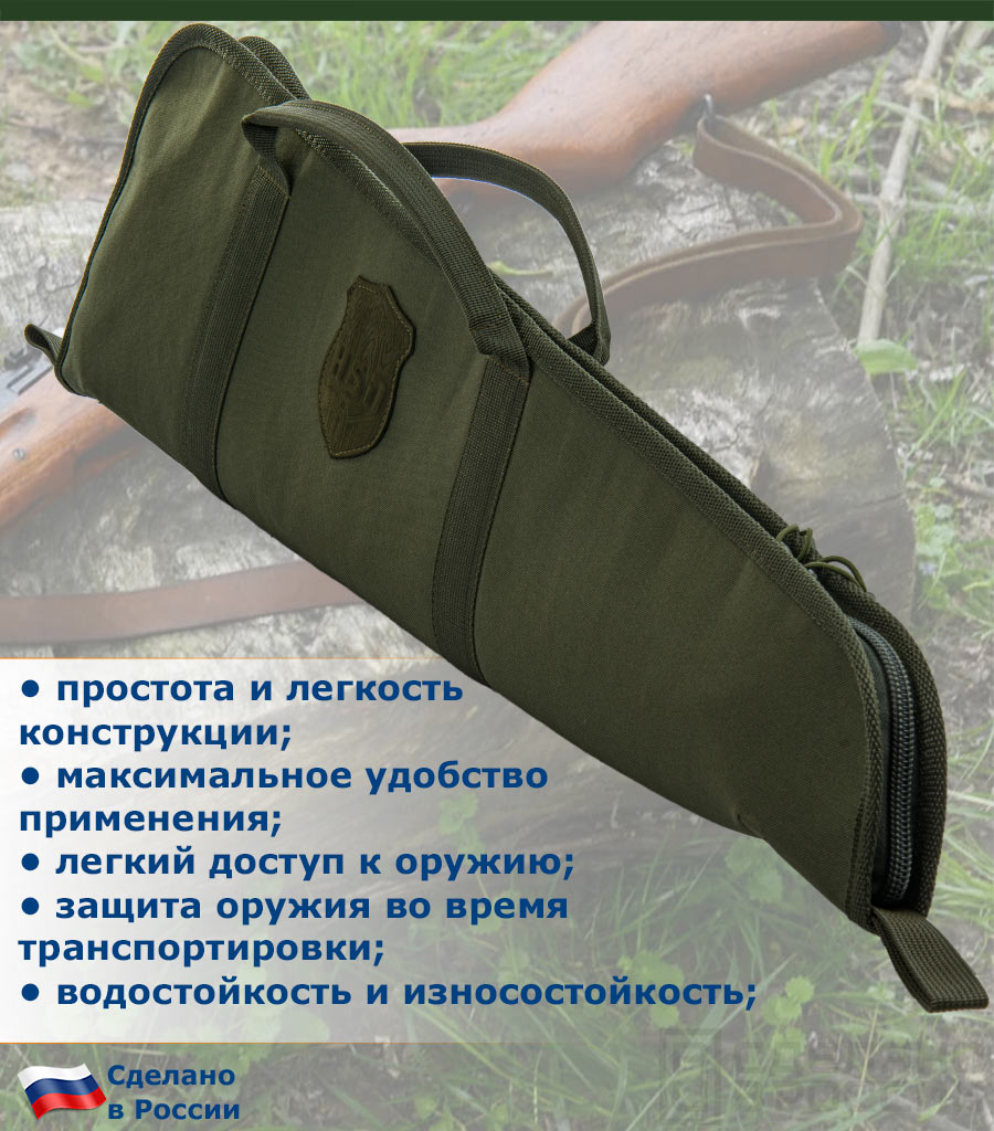 Конструктивно, чехол состоит из прочной водостойкой ткани «Оксфорд» 600D как внешнего жесткого слоя и мягкой внутренней подкладки из геотекстиля. Такое сочетание позволяет максимально защитить переносимое оружие.