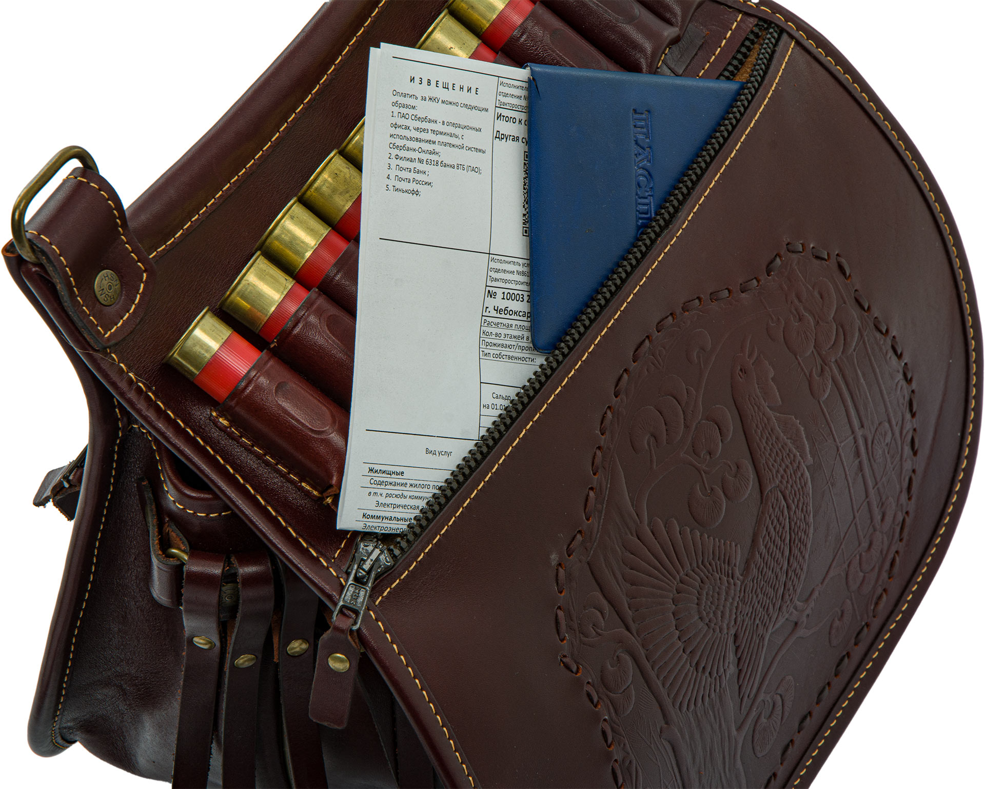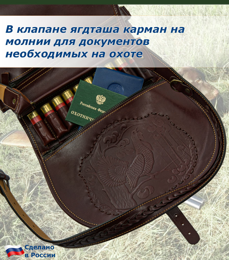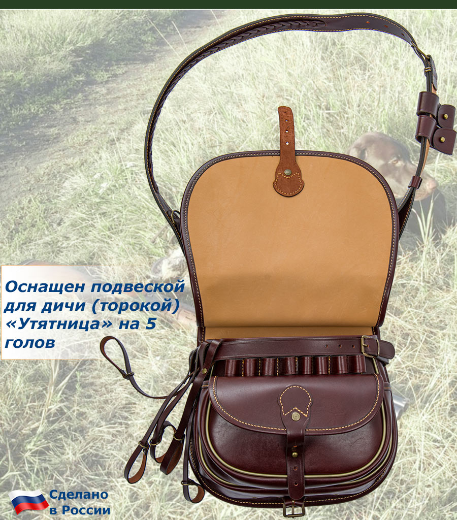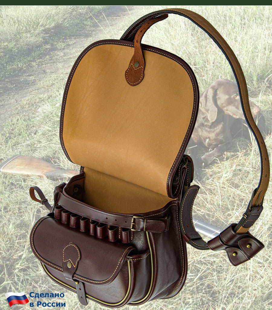 Предназначен для переноски патронов, дичи, документов и небольшого количества провизии во время охоты. Ягдташ изготовлен в традиционной форме из натуральной кожи. Имеет два отделения для снаряжения и карман в клапане для документов.
