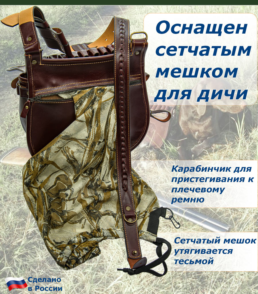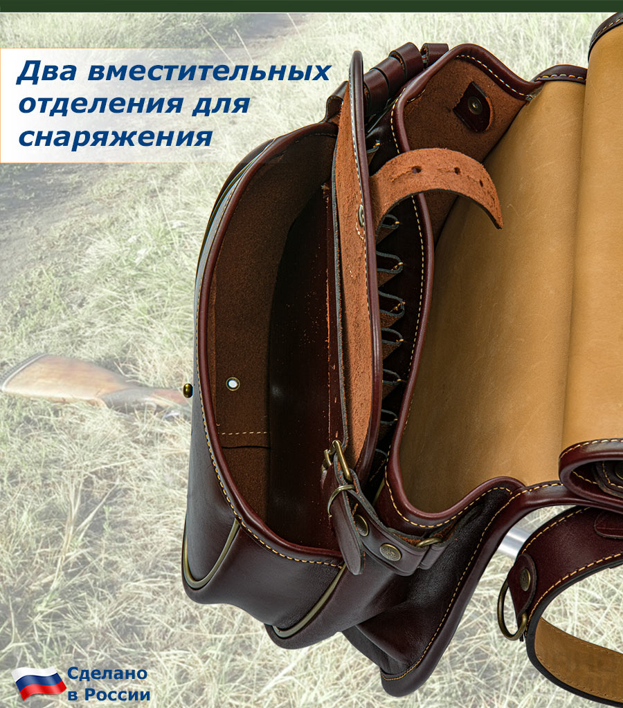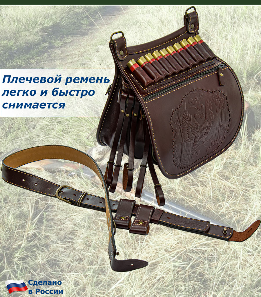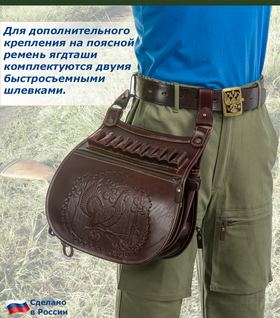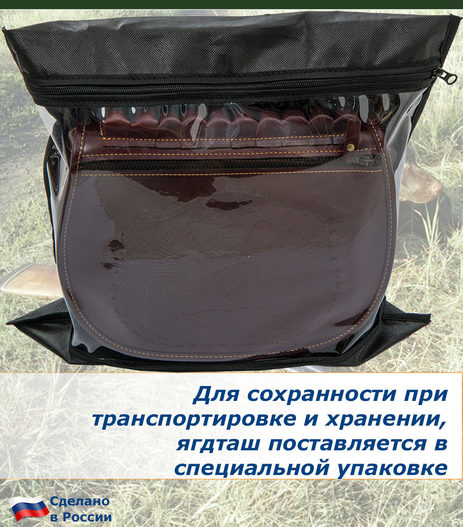Предназначен для переноски патронов, дичи, документов и небольшого количества провизии во время охоты. Ягдташ изготовлен в традиционной форме из натуральной кожи. Имеет два отделения для снаряжения и карман в клапане для документов.