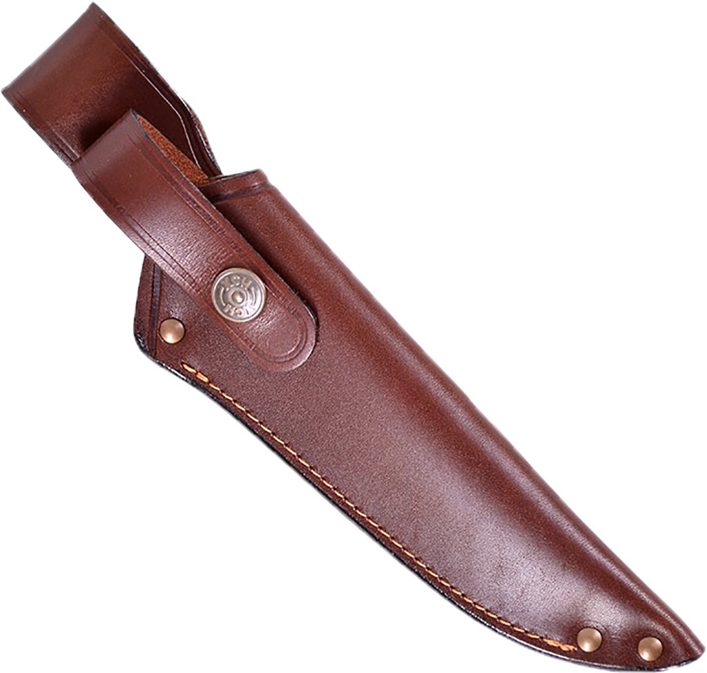 Плотная фиксация ножа в ножнах обеспечивается застёжкой поверх рукояти на кнопку.