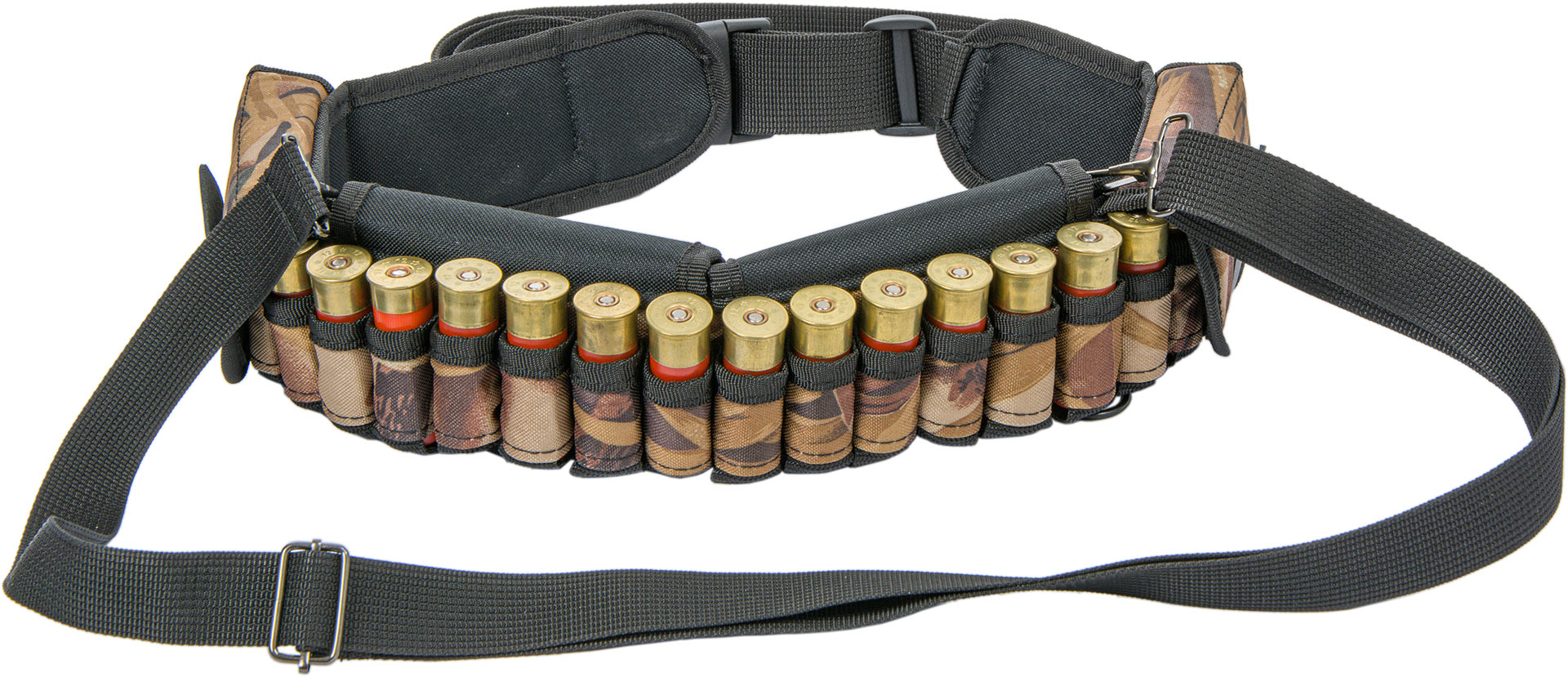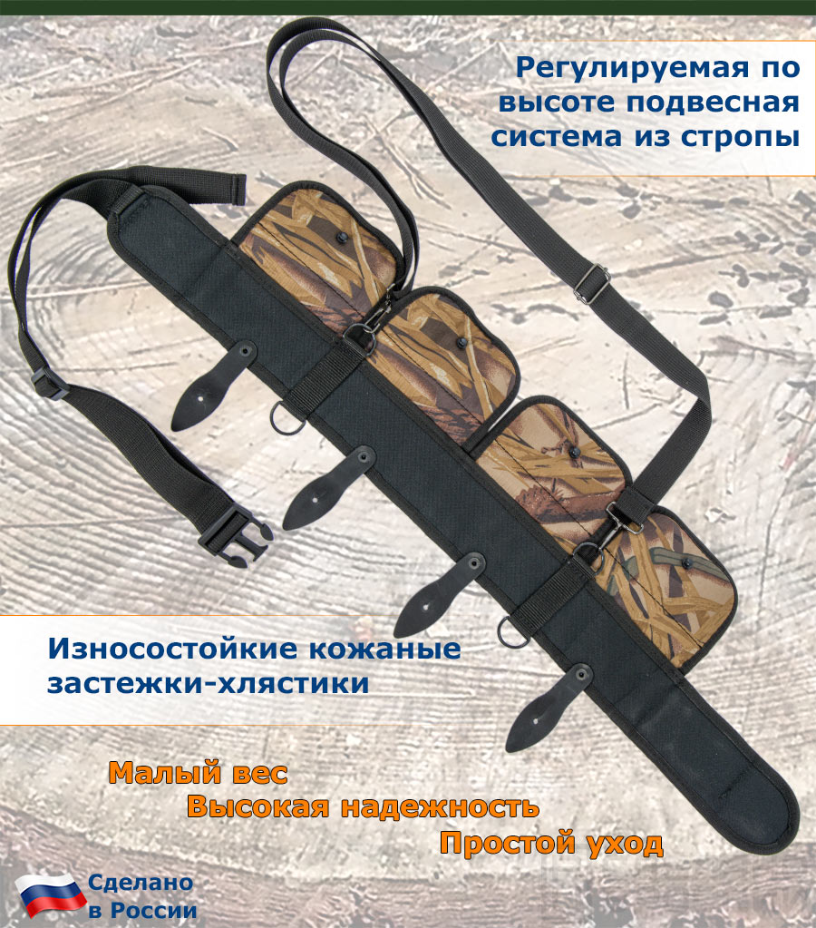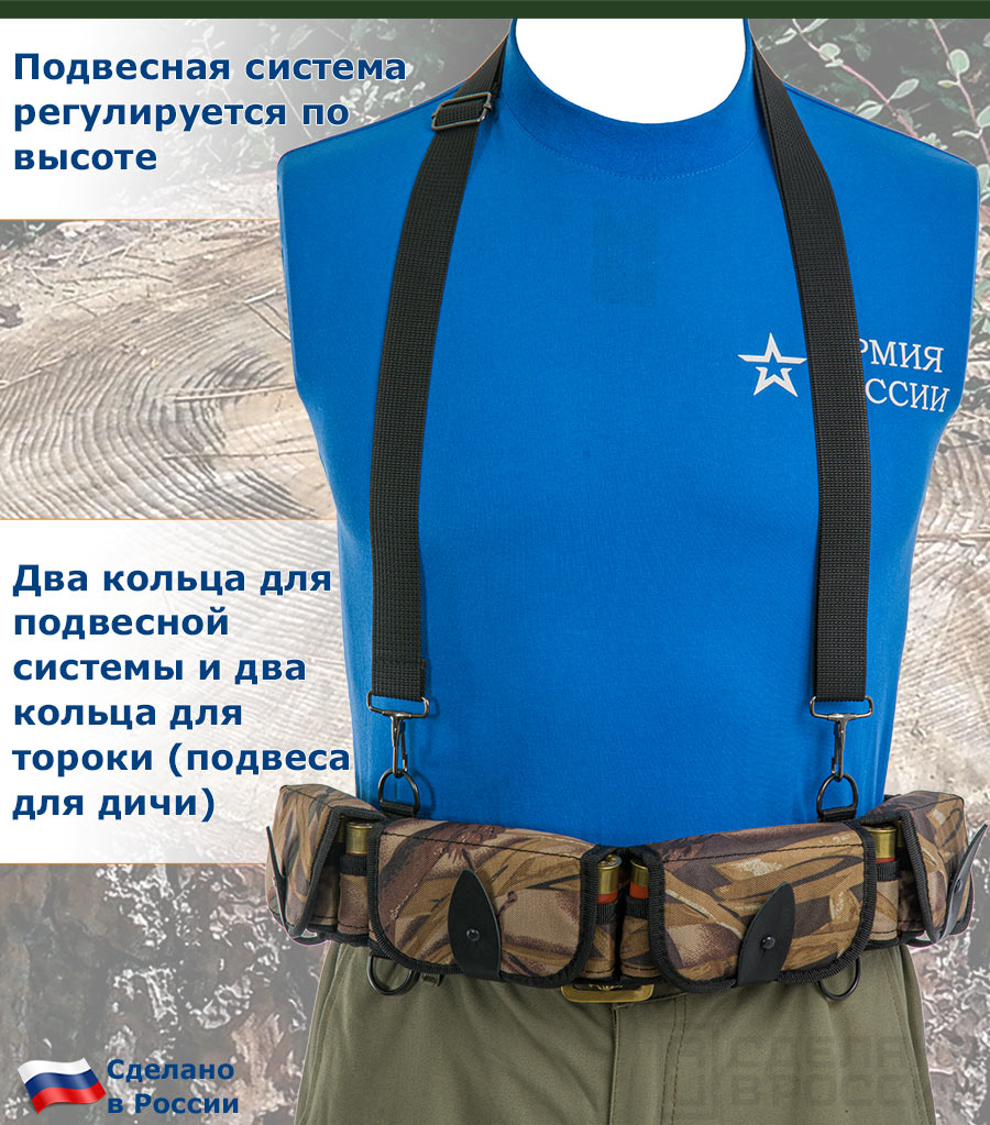 Для перераспределения веса на плечи и предотвращения спадание патронташа с области пояса комплектуется подвесной системой из высокопрочной стропы. Подвесная система имеет возможность отрегулировать положение по вертикали для максимального удобства.