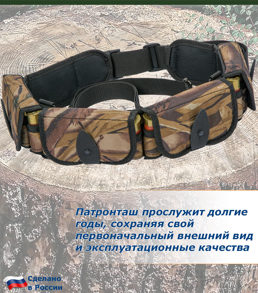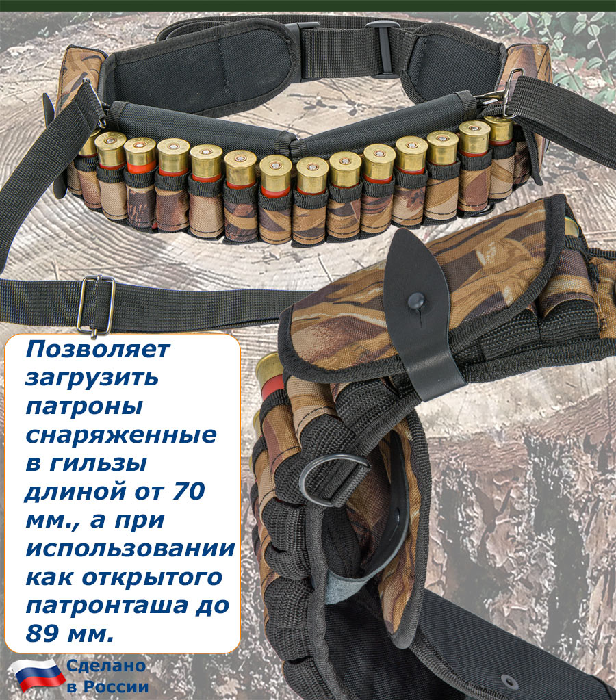 Патронташ надежно держит в лузах 24 патрона 12 калибра. Позволяет загрузить патроны снаряженные в гильзы длиной от 70 мм., а при использовании как открытого патронташа до 89 мм.