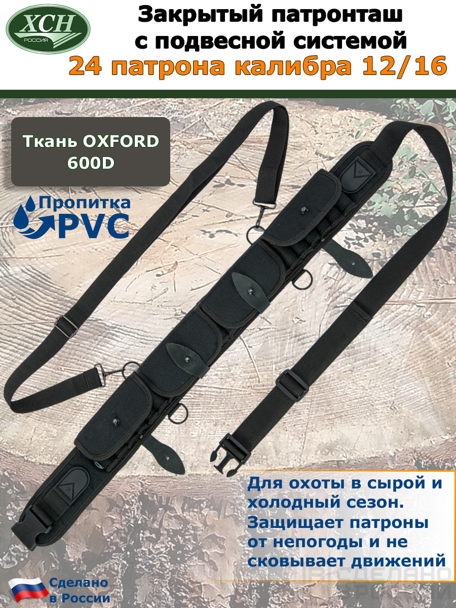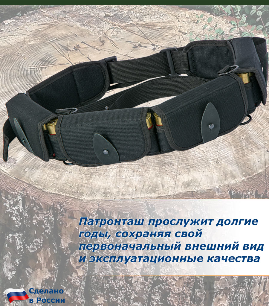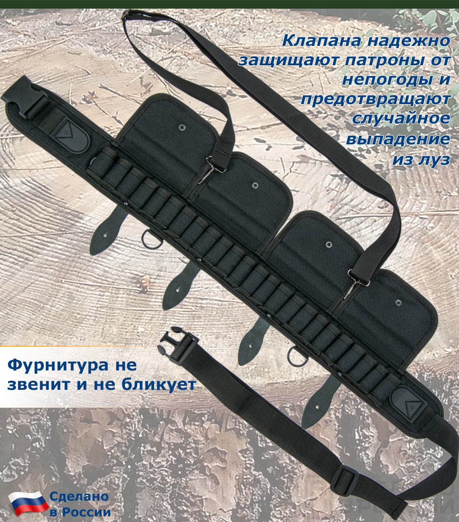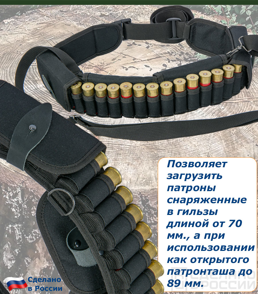 Патронташ надежно держит в лузах 24 патрона 12 калибра. Позволяет загрузить патроны снаряженные в гильзы длиной от 70 мм., а при использовании как открытого патронташа до 89 мм. Оснащен клапанами для защиты патронов от непогоды и случайного выпадания боеприпасов.