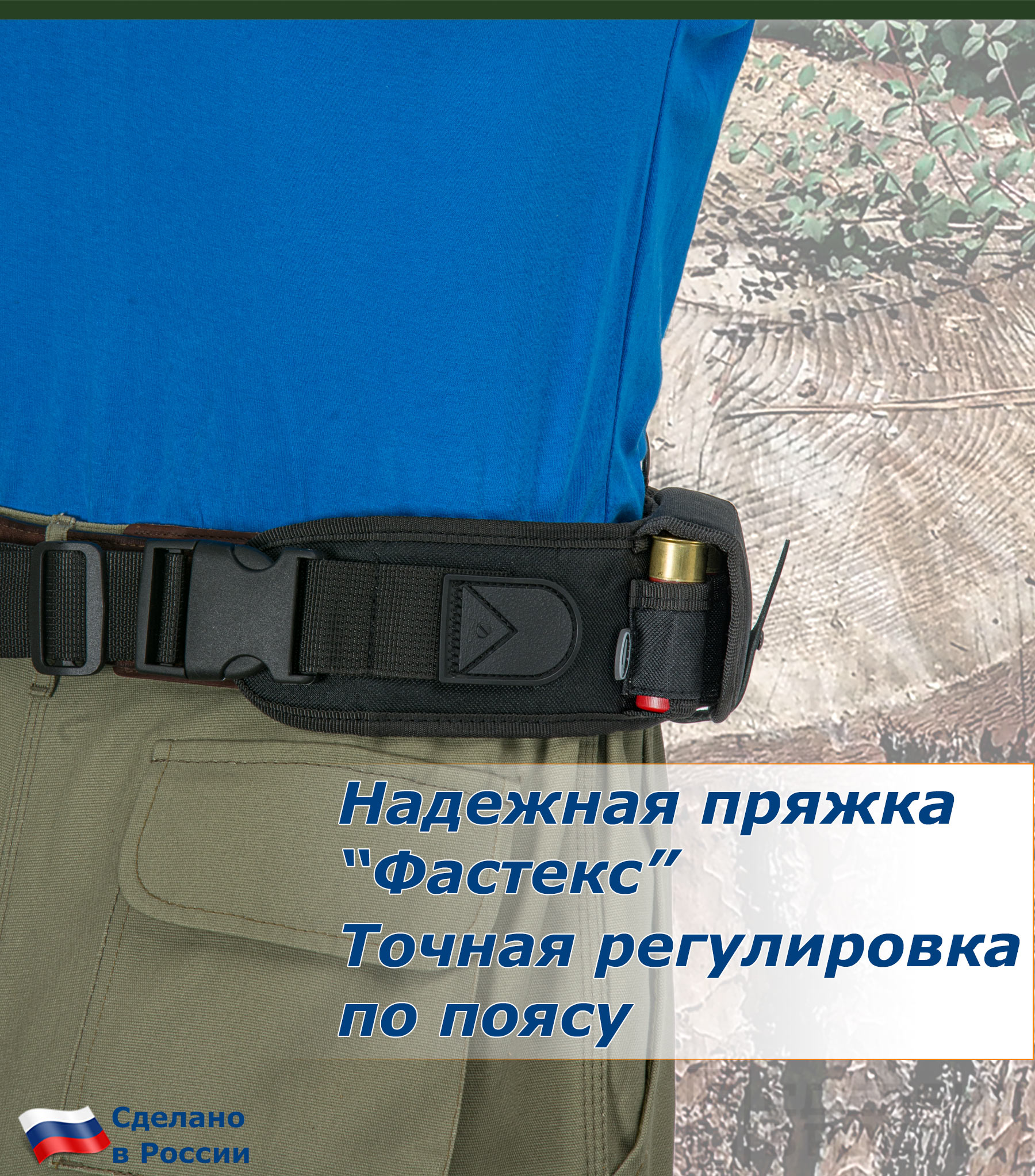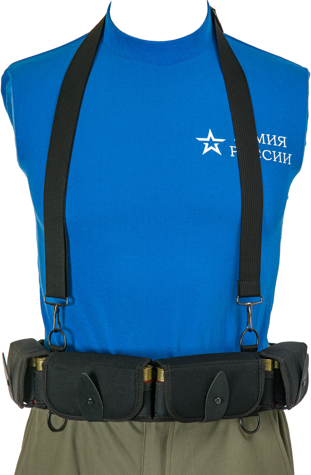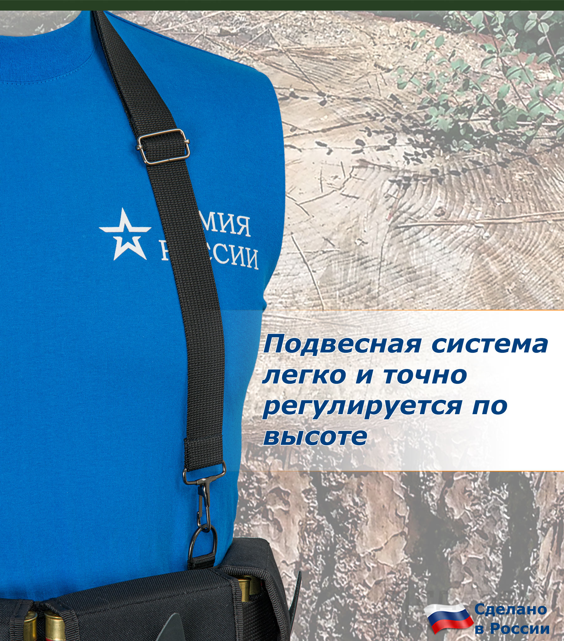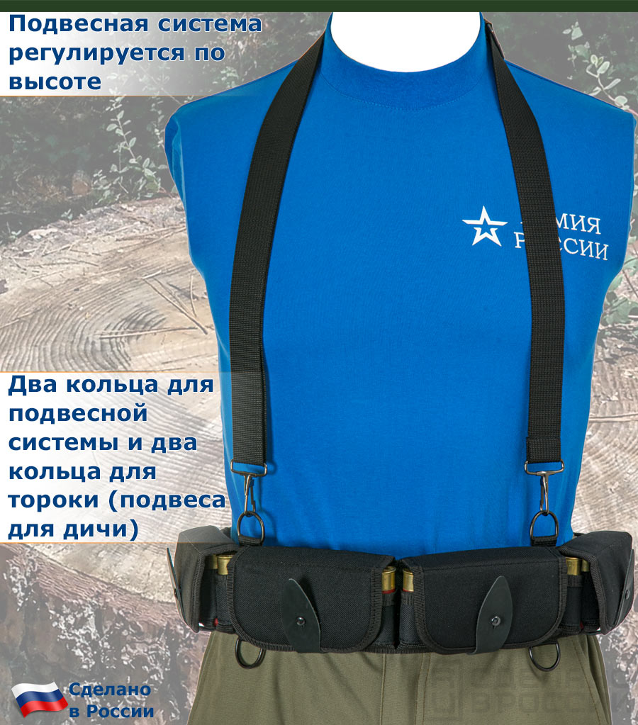 Для перераспределения веса на плечи и предотвращения спадание патронташа с области пояса комплектуется подвесной системой из высокопрочной стропы. Подвесная система имеет возможность отрегулировать положение по вертикали для максимального удобства.