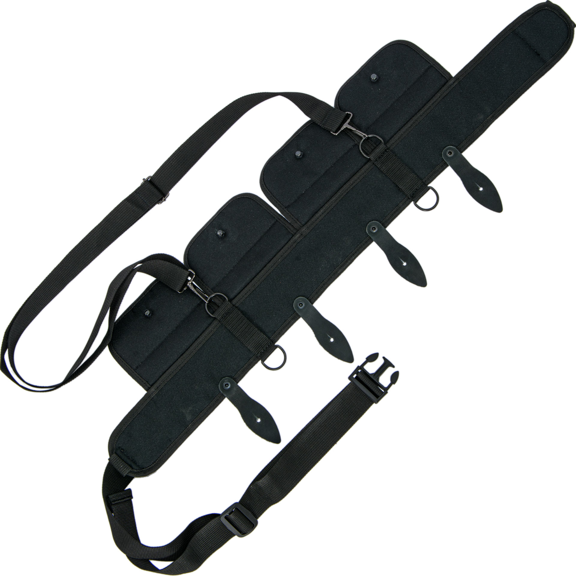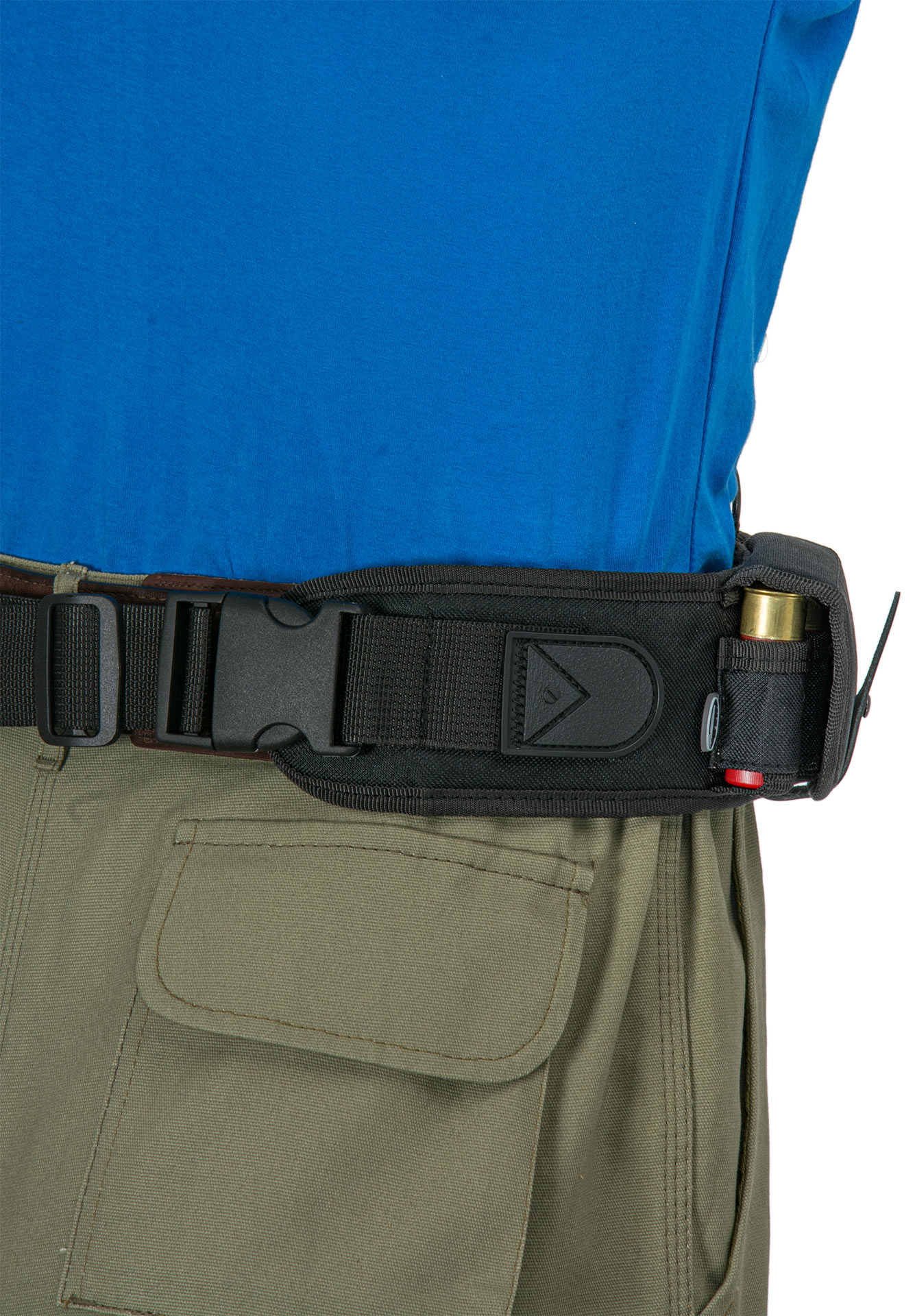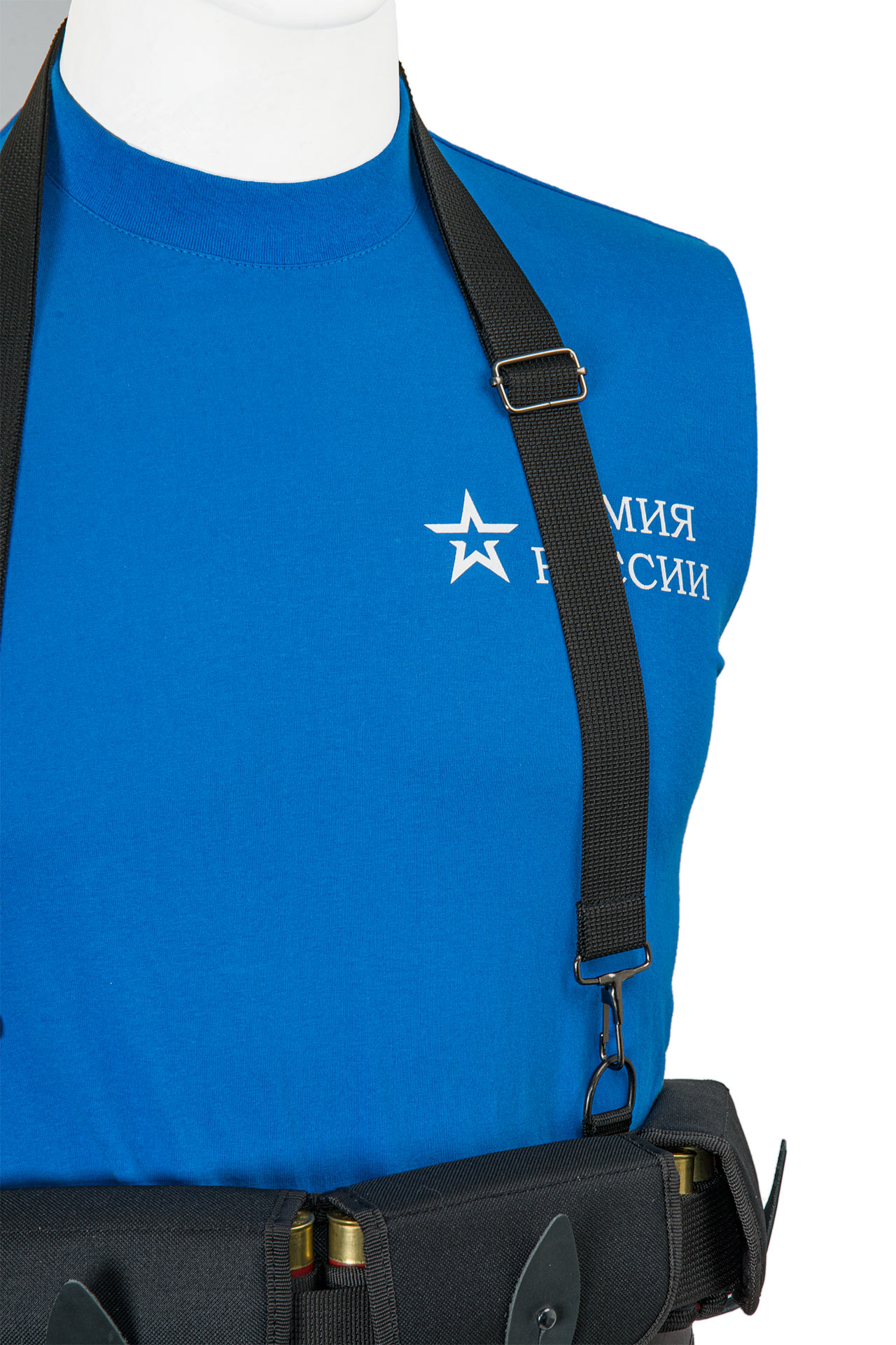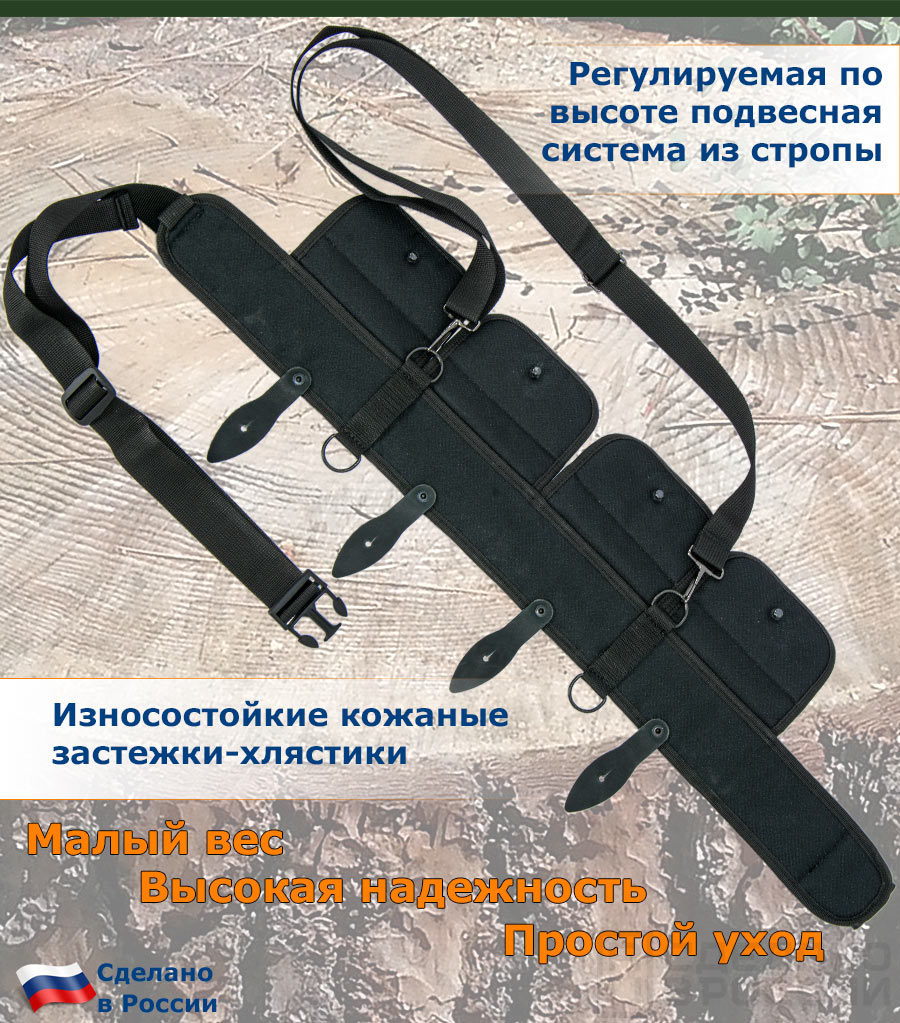 Для перераспределения веса на плечи и предотвращения спадание патронташа с области пояса комплектуется подвесной системой из высокопрочной стропы. Подвесная система имеет возможность отрегулировать положение по вертикали для максимального удобства.