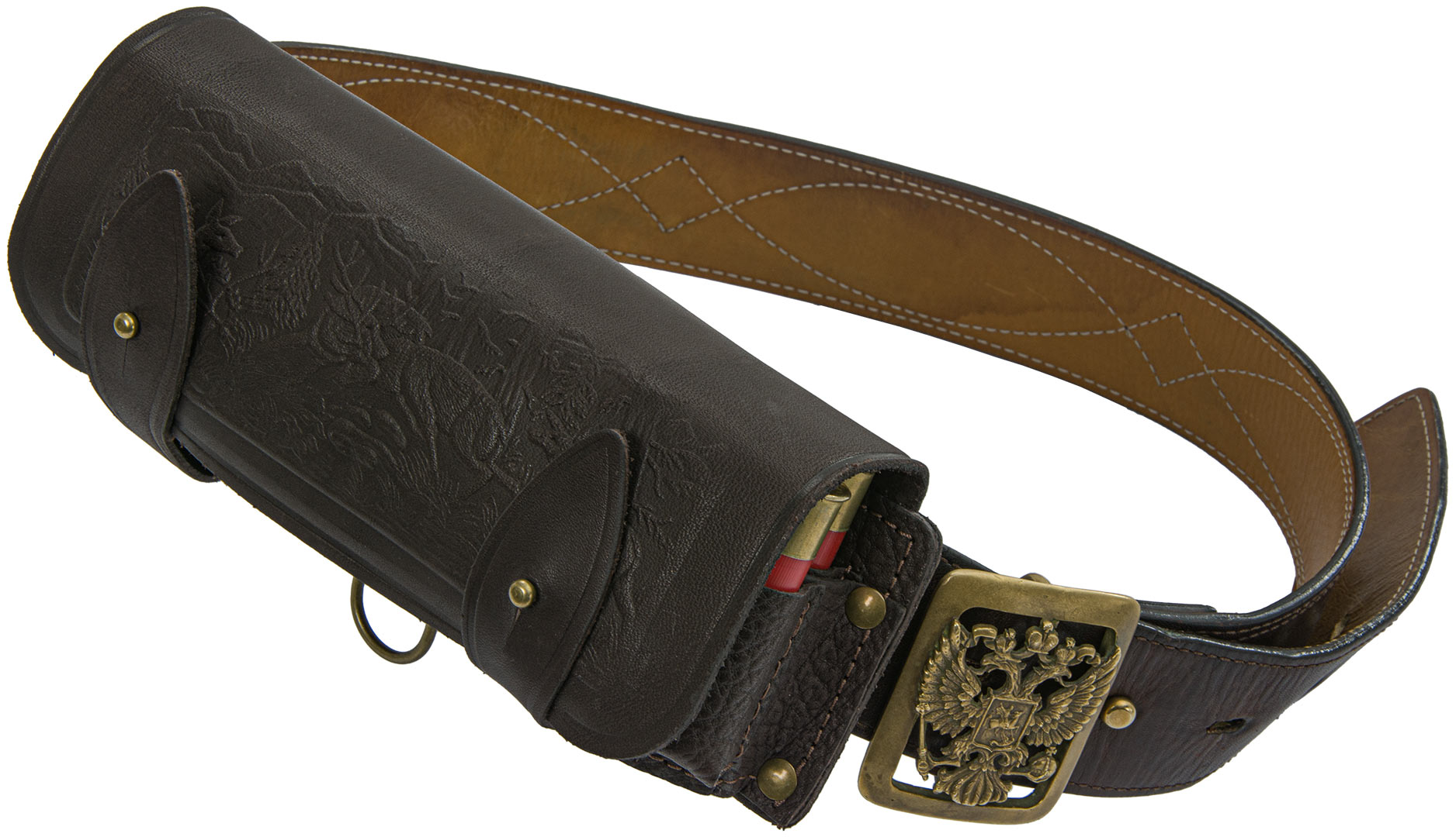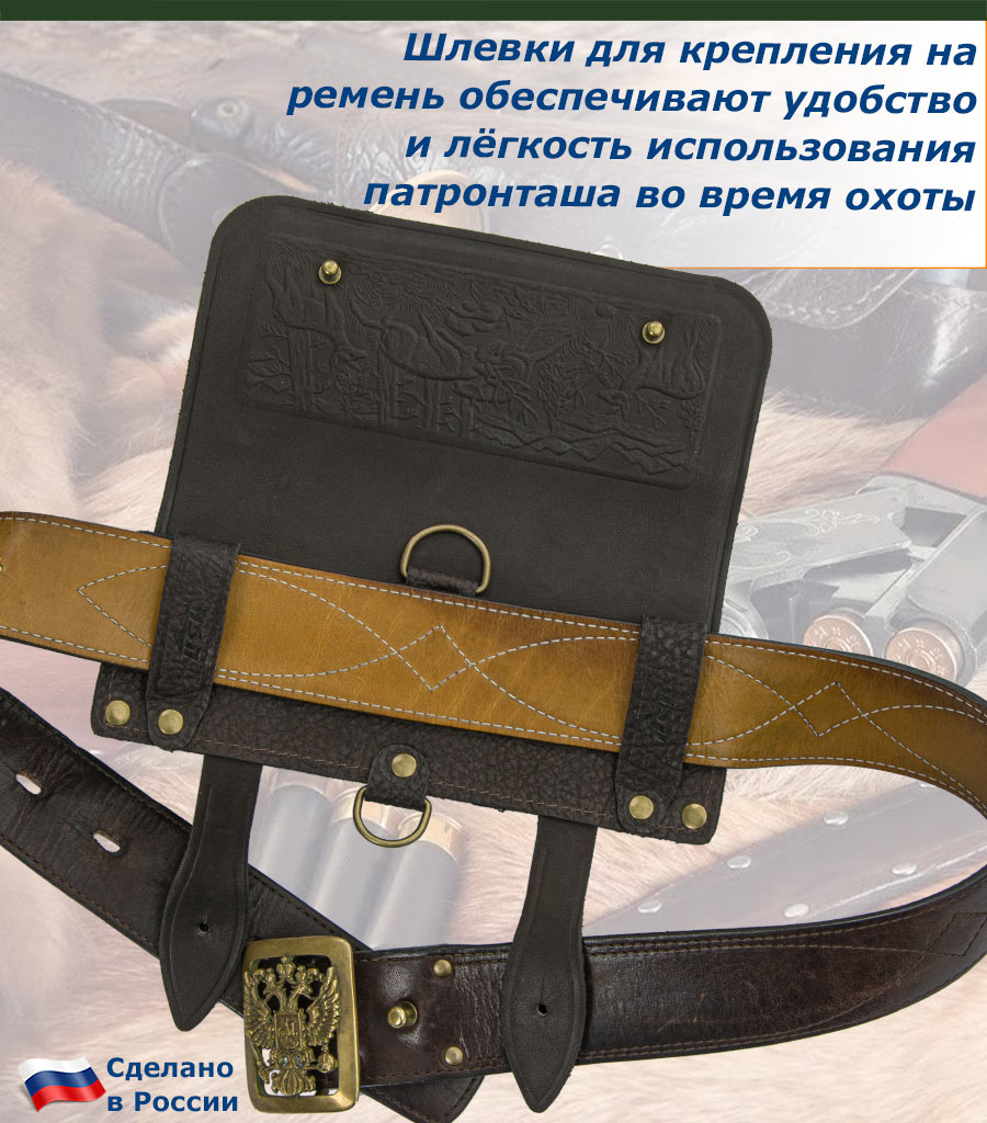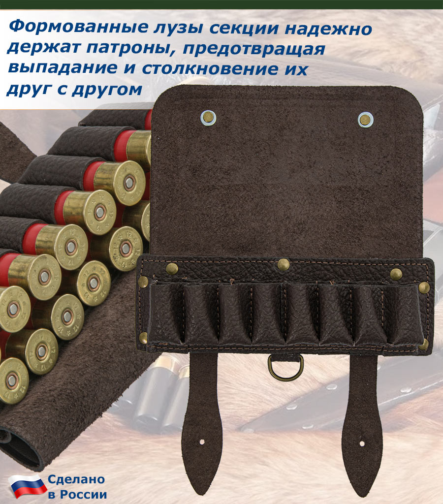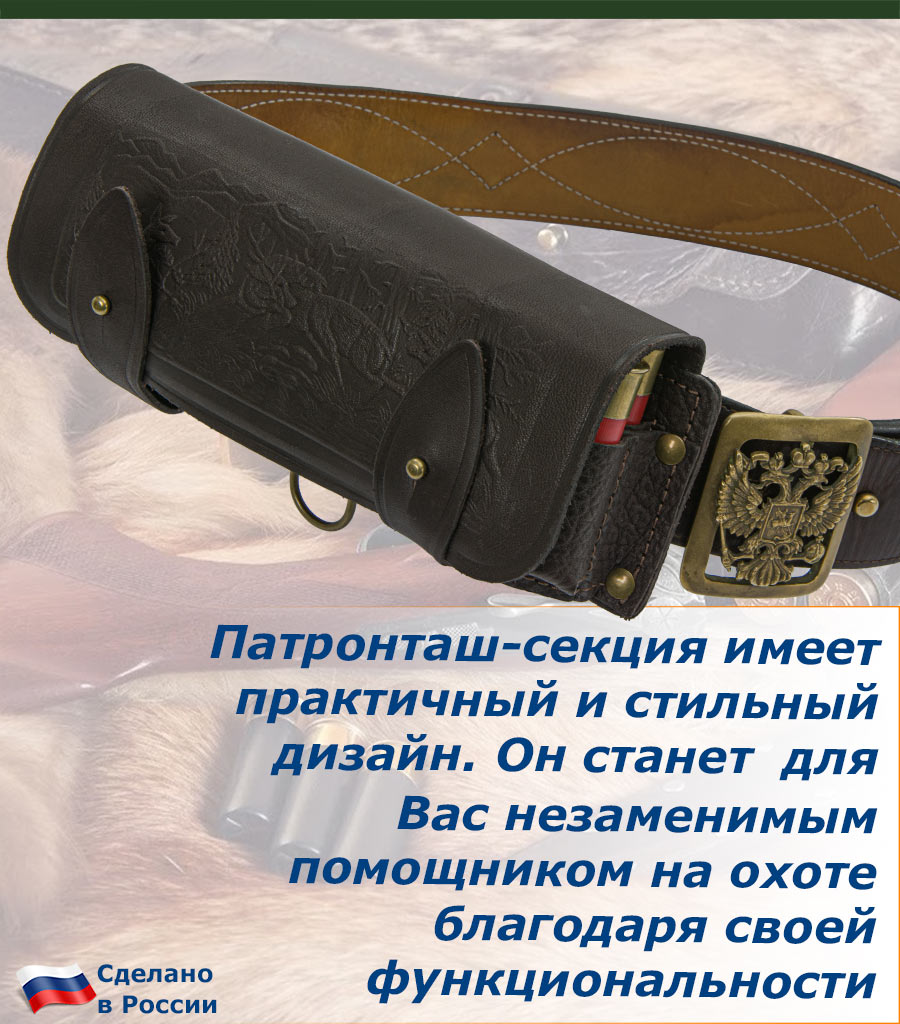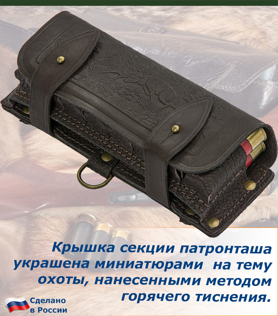 Секция для патронов с качественной фурнитурой обеспечивает надежность и долговечность изделия. Прочный, кожаный патронташ надёжно удерживает охотничьи патроны в формованных лузах из натуральной кожи.