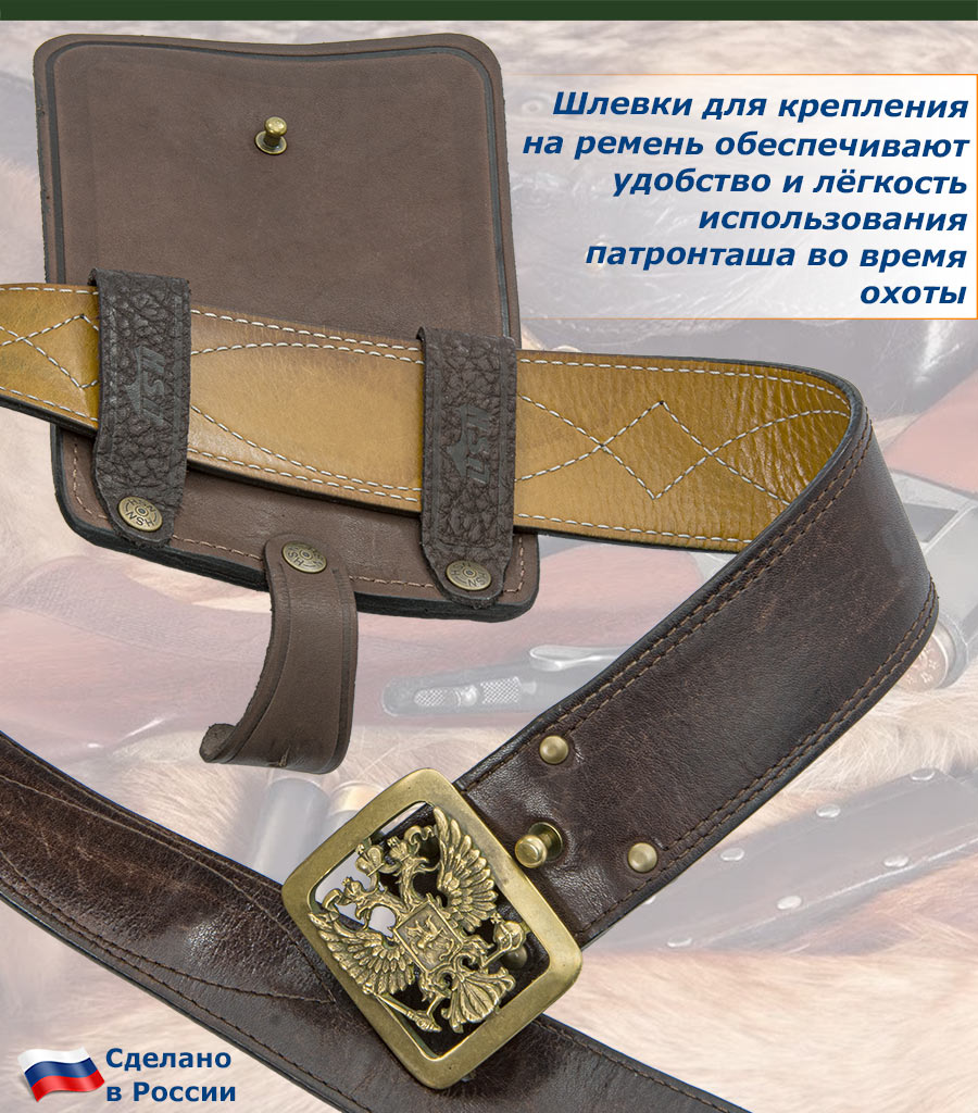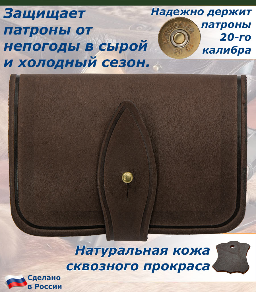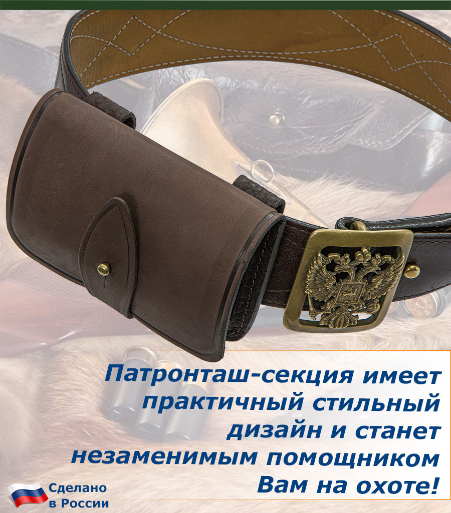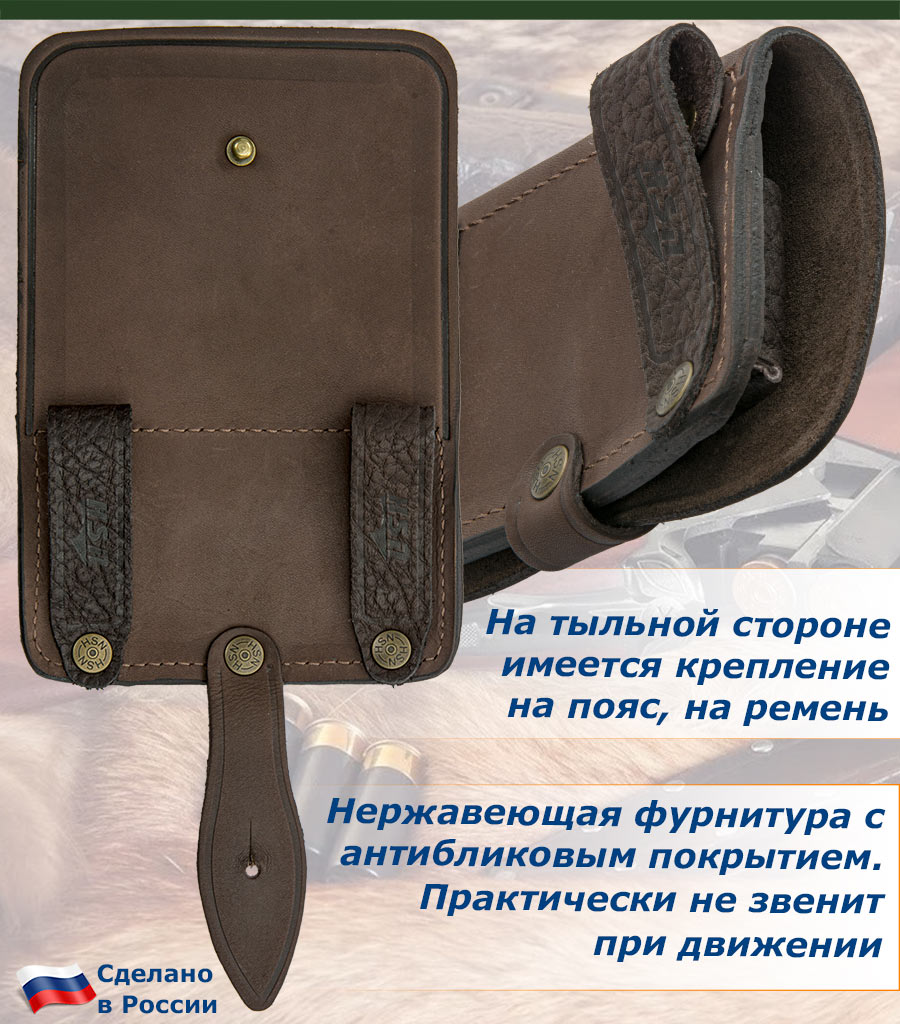 Оснащен защитным клапаном с хлястиком из натуральной кожи, который надежно защищает патроны от попадания дождя и снега, сохраняя их в рабочем состоянии.