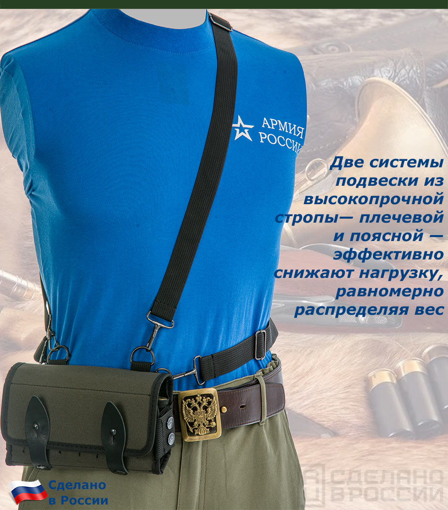 Патронташ позволяет загрузить патроны, снаряженные в гильзы длиной от 70 мм., а при использовании как открытого патронташа до 89 мм. Ношение тактического подсумка для патронов в режиме открытого патронташа, позволяет быстро производить смену патронов.