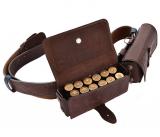 Изготовлен в традиционной форме из натуральной кожи. Надежно держат патроны в лузах. Позволяют загрузить патроны снаряженные в гильзы длиной от 70 мм. до 89 мм. Оснащены клапанами для защиты патронов от непогоды. В производстве используется качественная фурнитура, которая практически не дает бликов. Секции украшены миниатюрами охотничьей тематики, нанесенным методом горячего тиснения.